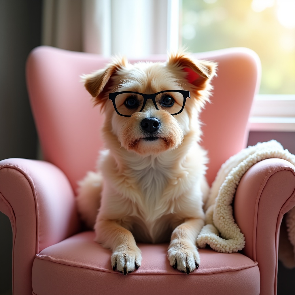 A small dog wearing black glasses sits on a pink chair. The dog looks at the camera with interest. Light shines through a nearby window.