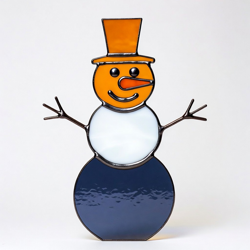 A snowman crafted from glass stands with a top hat. Its bright colors attract attention as it sits on a flat surface indoors.