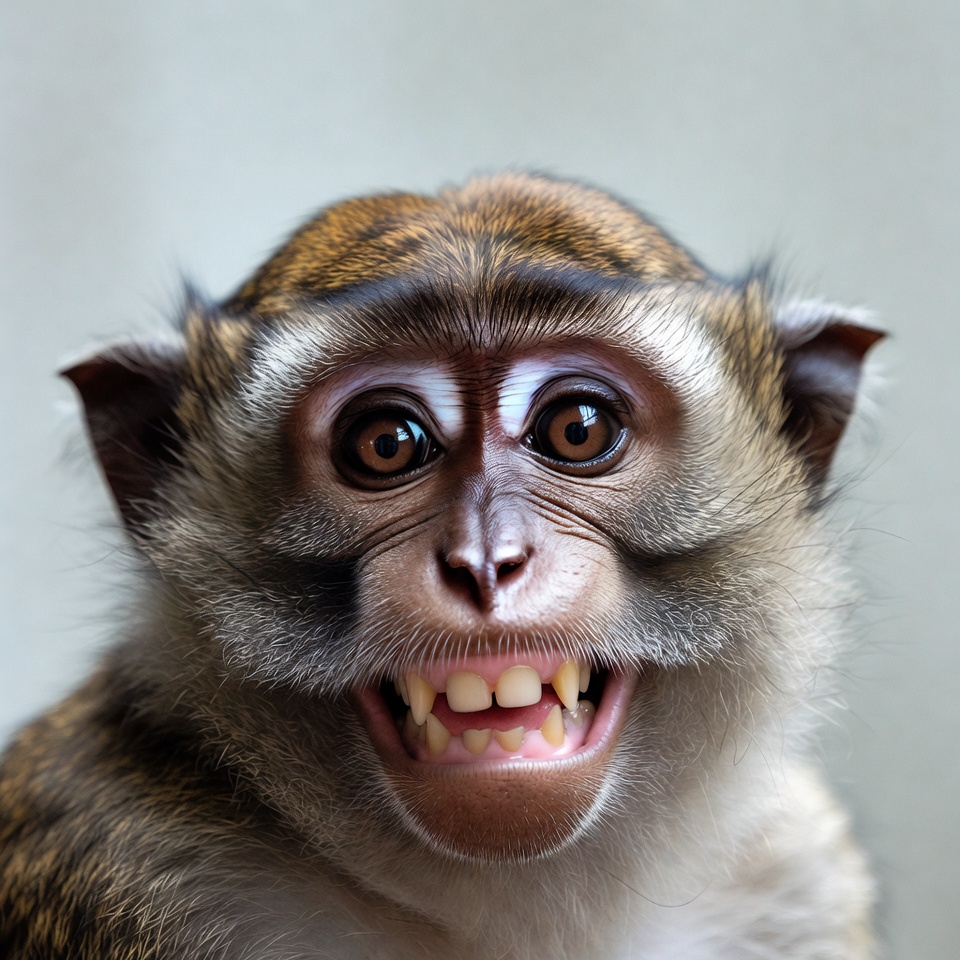 A monkey shows its teeth while looking directly at the camera. The background is simple with soft colors.