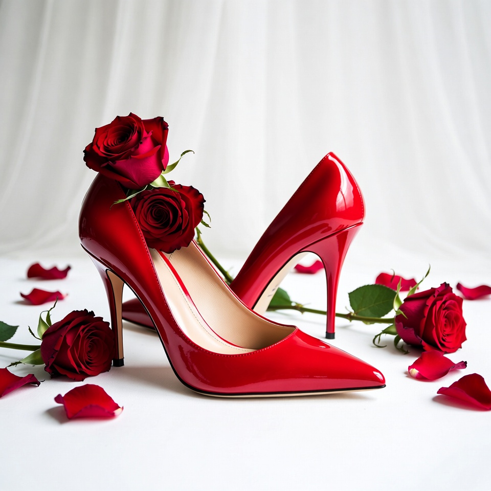 Red high-heeled shoes sit on a white surface surrounded by red roses and petals. The shoes are glossy and pointed.
