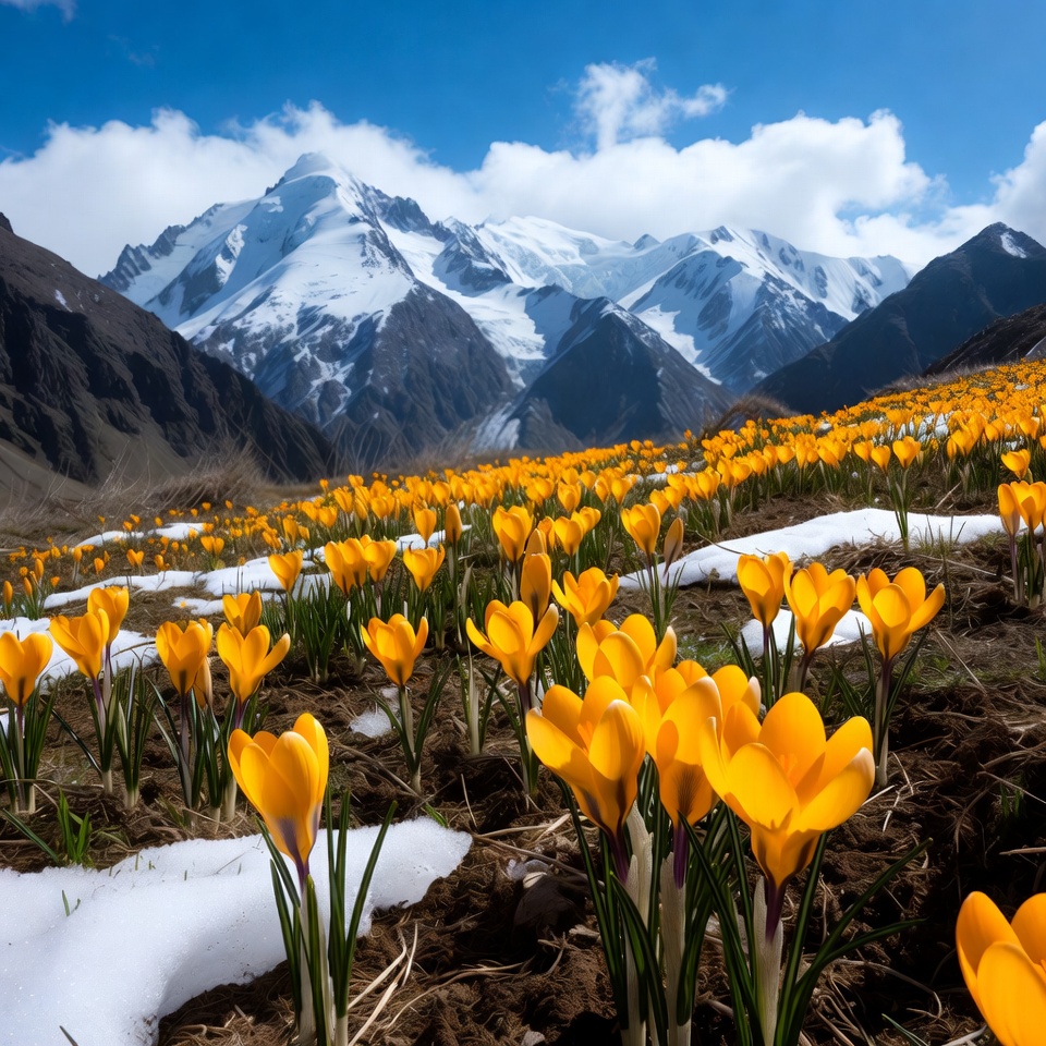 beauty, bloom, clouds, crocus, field, flora, fresh, growth, hiking, landscape, mountain, nature, outdoor, peaks, season, sky, snow, spring, vegetation, yellow flowers