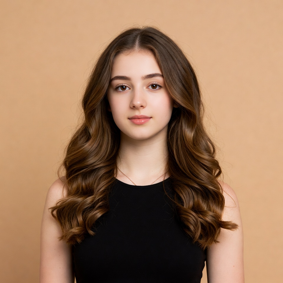 A young person with long wavy hair stands still, looking directly at the camera with a simple beige background.