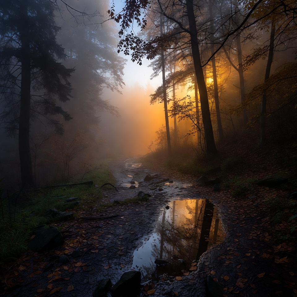 Foggy forest trail at sunset