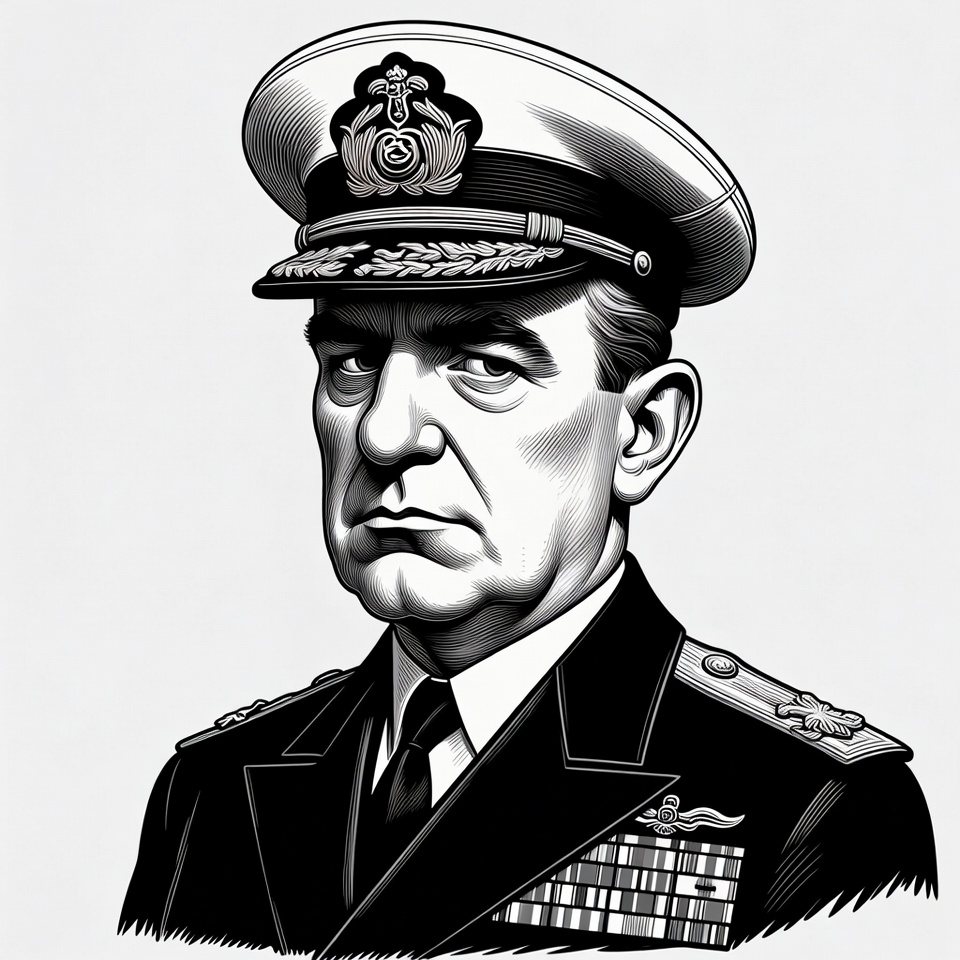 A man in a naval uniform stands with a serious expression. His uniform shows many medals and insignia, highlighting his rank and experience.