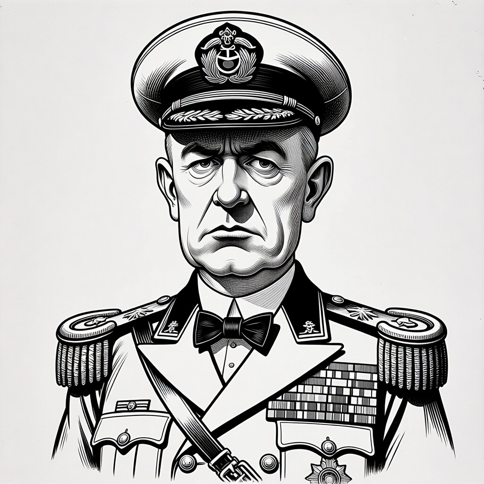 A military figure stands in a formal pose, wearing a uniform decorated with medals. The setting is plain, highlighting the attire.