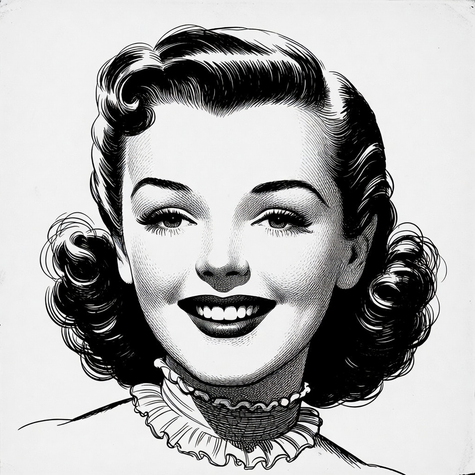art, bold, character, cheerful, curly hair, design, drawing, expression, face, hairstyle, happiness, illustration, joy, lines, ruffled collar, simple, smile, style, vintage, woman