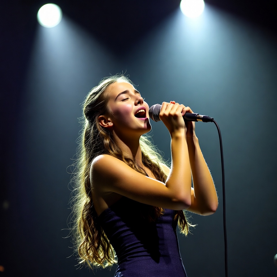 A young girl sings passionately using a microphone during a performance under bright stage lights.