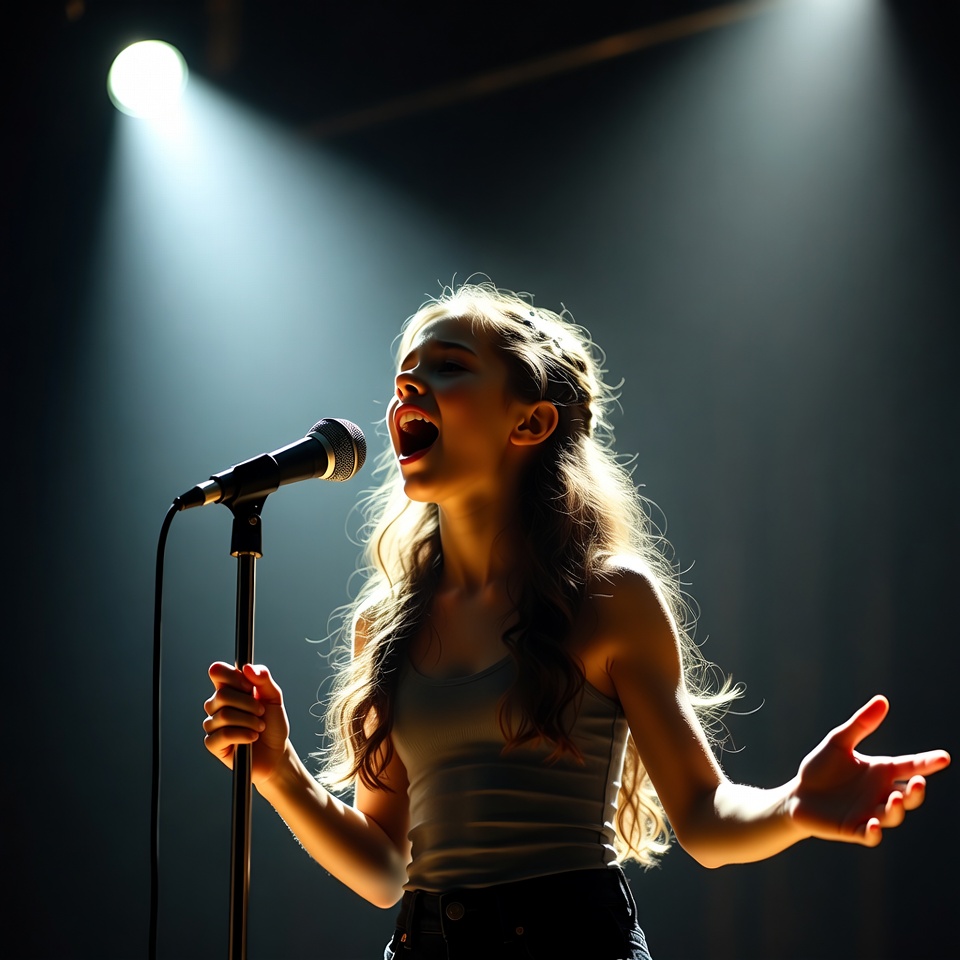 A young singer stands on stage under bright lights, passionately singing into a microphone during a performance.