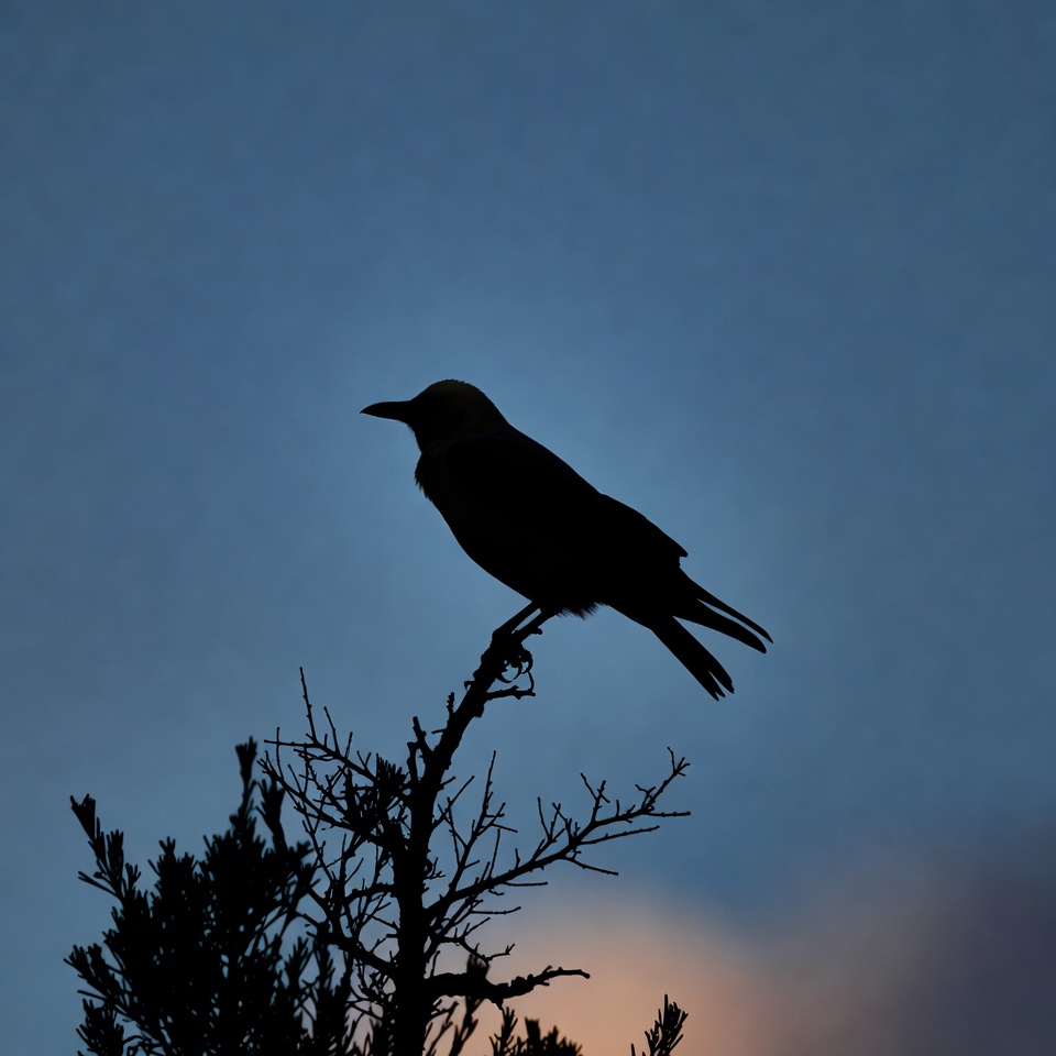 animal, bird, branch, calm, cloud, dark, dusk, evening, feathered, nature, outdoors, perch, scenery, shadow, silhouette, sky, songbird, sunset, tree, wildlife