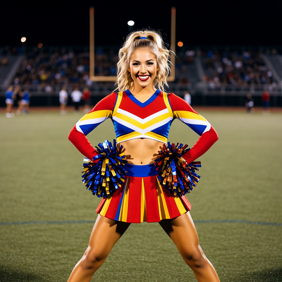 activity, athletic, cheerleader, cheers, competition, crowd, energy, excitement, field, football, game, high school, lights, night, performance, pom poms, sports, stadium, team, uniform