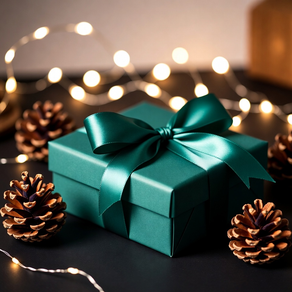 A green gift box sits on a dark surface surrounded by pinecones and string lights, creating a festive atmosphere for a celebration.