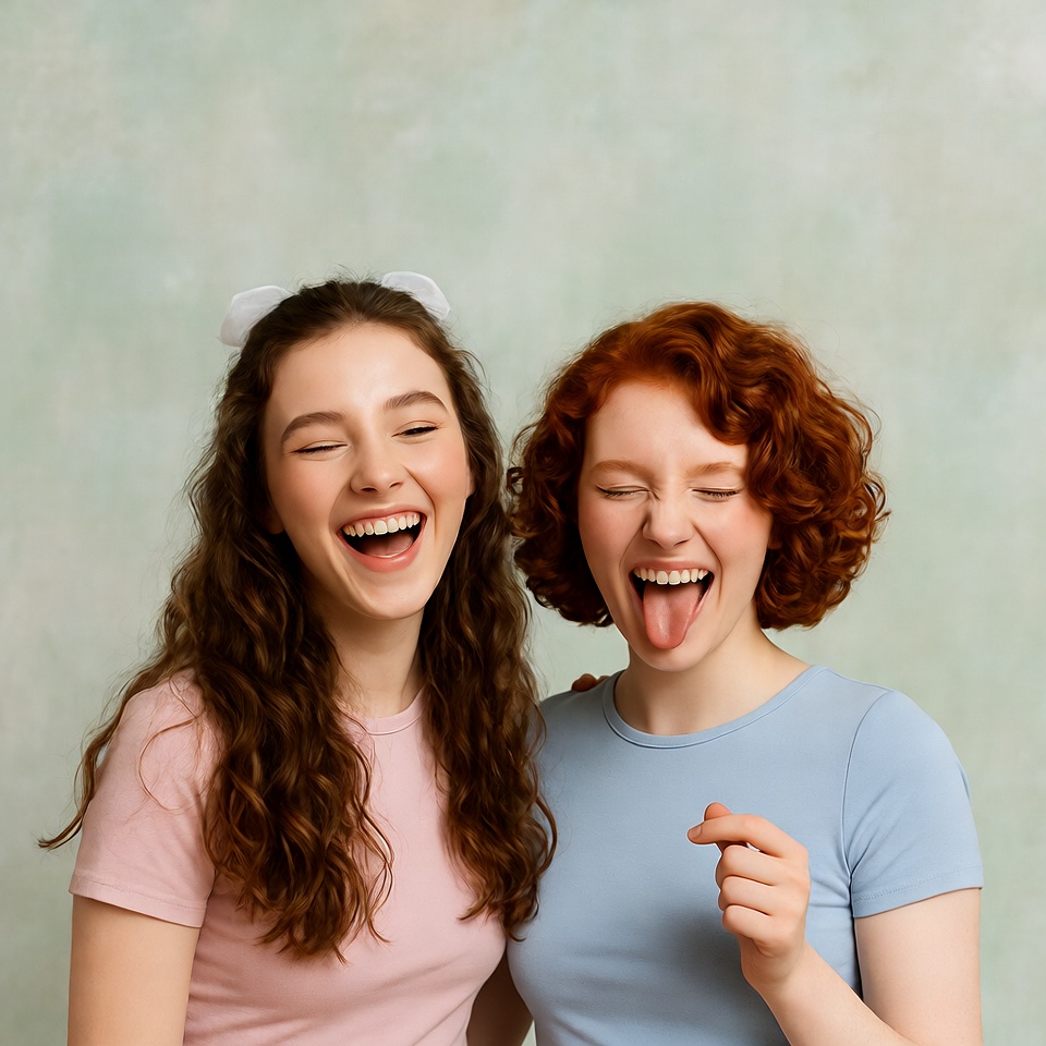 Two young women smile brightly together, enjoying a moment of joy in a studio. Their playful expressions show a strong friendship.