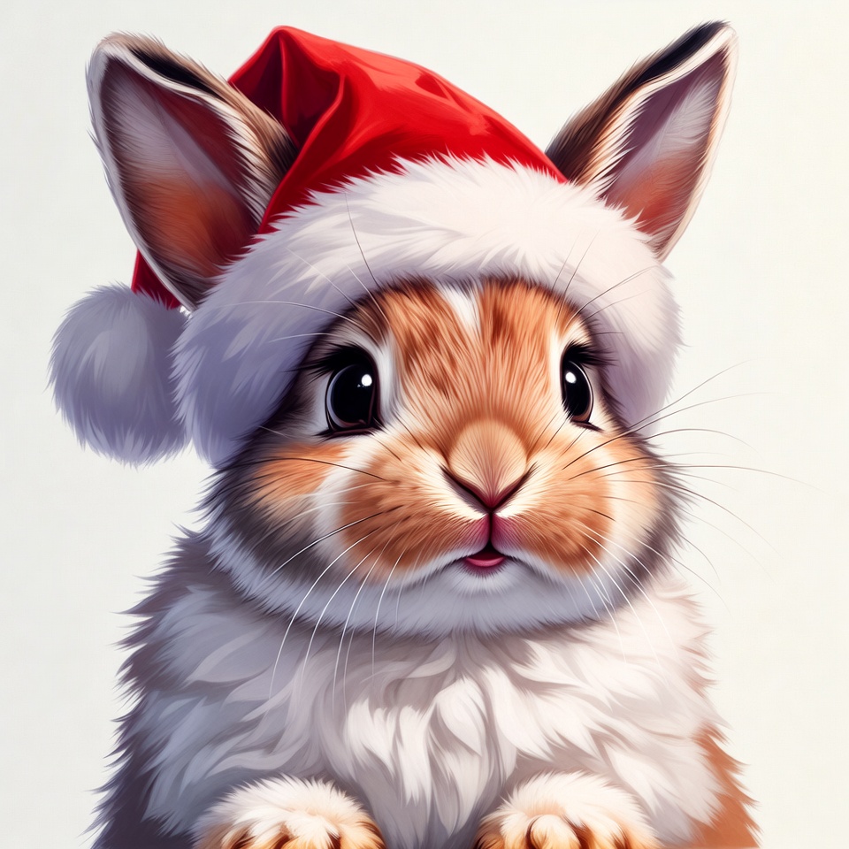 A rabbit wears a red Santa hat. The rabbit has soft fur and big eyes. It looks cheerful and ready for the holiday season.