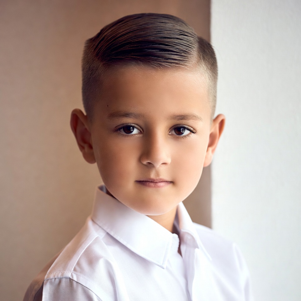 A boy with short hair is looking at the camera while wearing a white shirt. He is indoors, in a well-lit room.