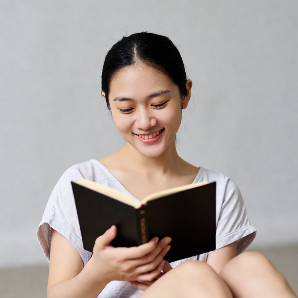 book, casual, concentration, enjoyment, floor, happy, indoor, leisure, light, pages, quiet, reading, relaxation, room, simple, sitting, smile, turn, woman, young