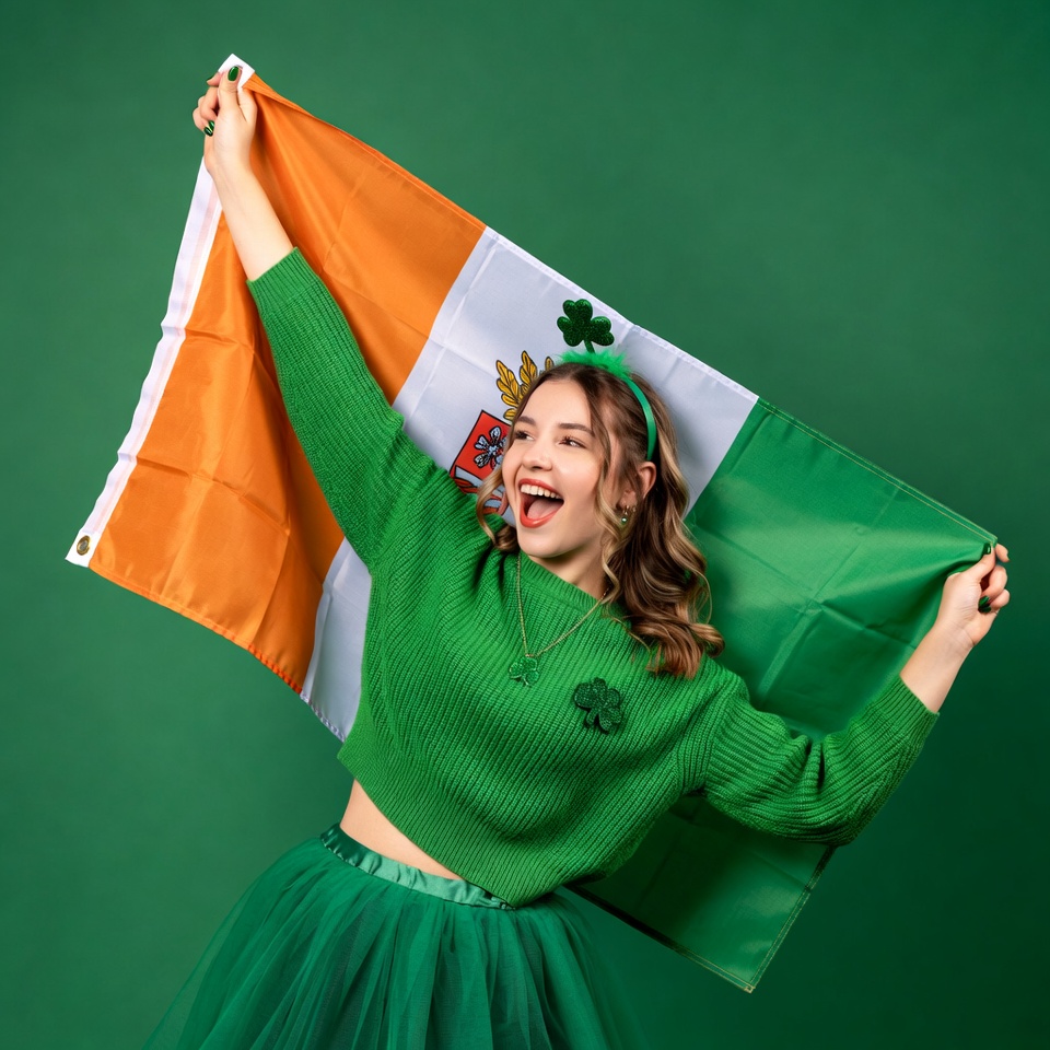 A person celebrates while holding an Irish flag. The mood is festive as they wear green clothing and accessories, enjoying the occasion.