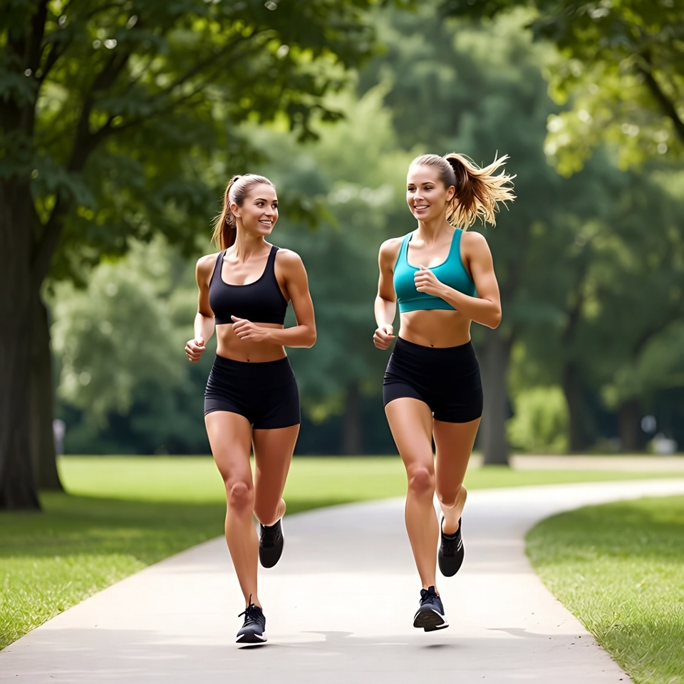 Two women jog side by side on a path in a green park during daylight. They wear sports clothing and smile while exercising together.