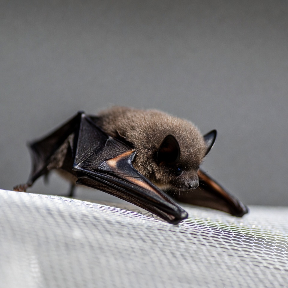 A small bat is perched on a surface. It has dark wings and fur, with its eyes looking ahead. The setting is neutral in color.