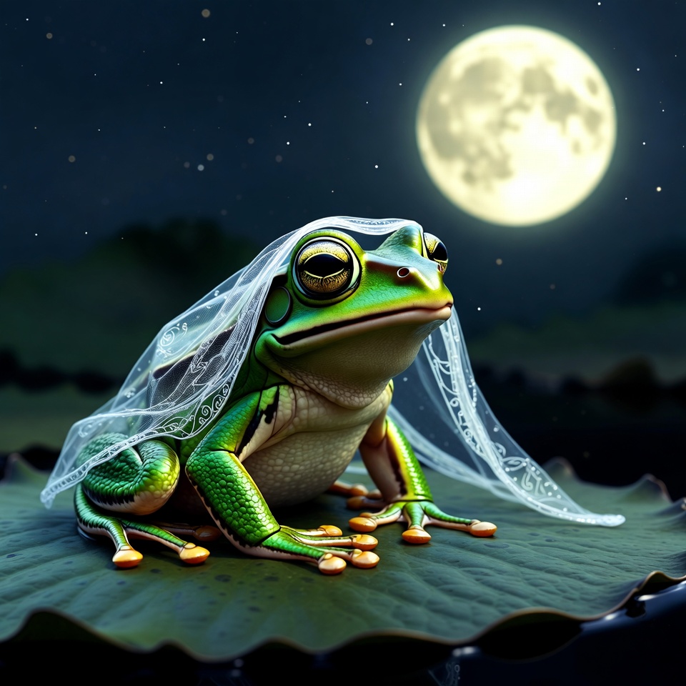 A frog sits on a leaf wearing a wedding veil under a bright moon. The scene captures a playful moment in nature.