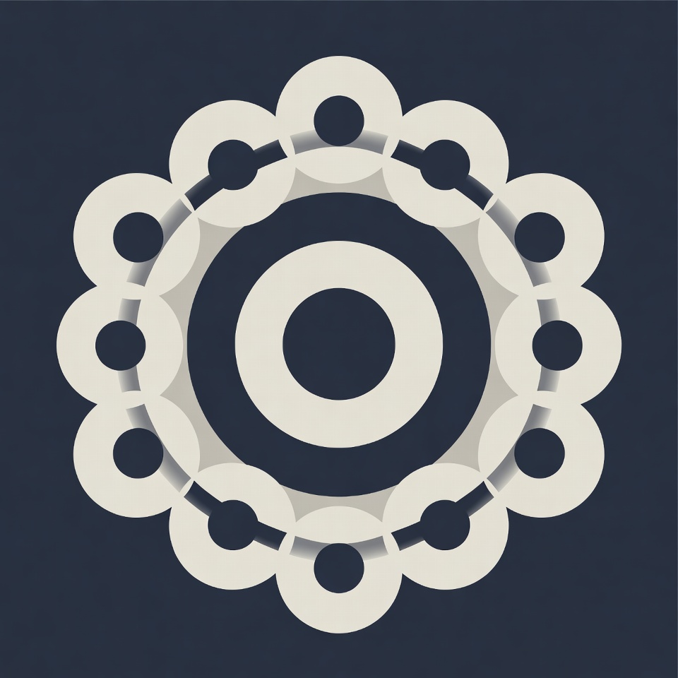 A round design with inner circles and outer loops sits on a dark backdrop. The shapes connect in a pattern that draws the eye.