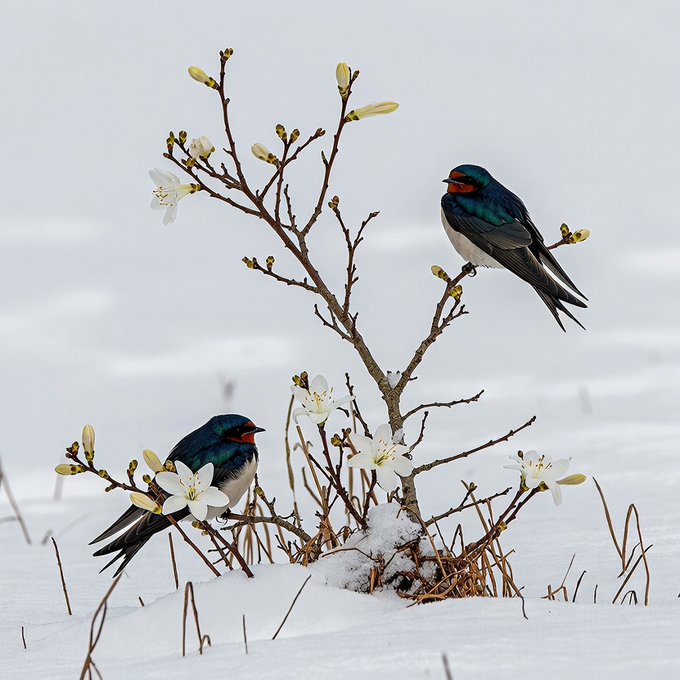Two birds sit on a branch with white flowers in a snowy landscape. The scene shows nature's contrast between winter and spring.
