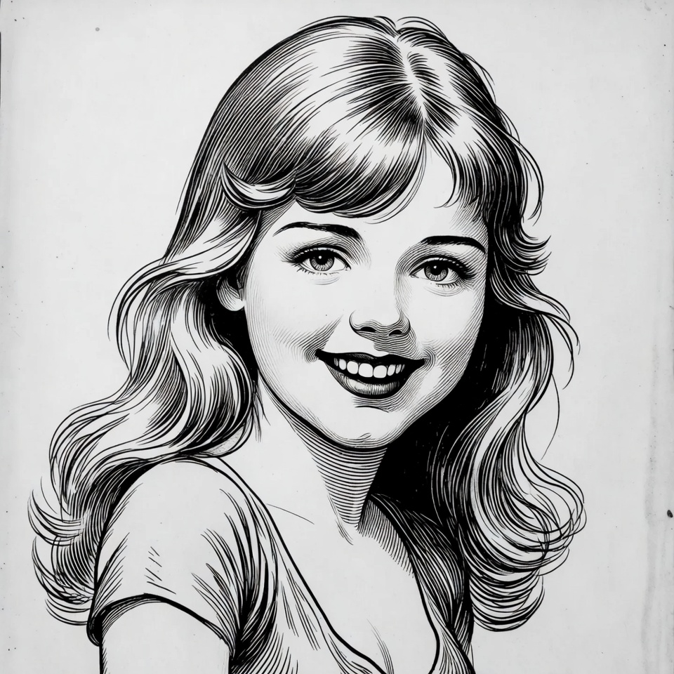 A young girl is smiling. She has long hair and an inviting expression. The style is simple and clear, highlighting her features.