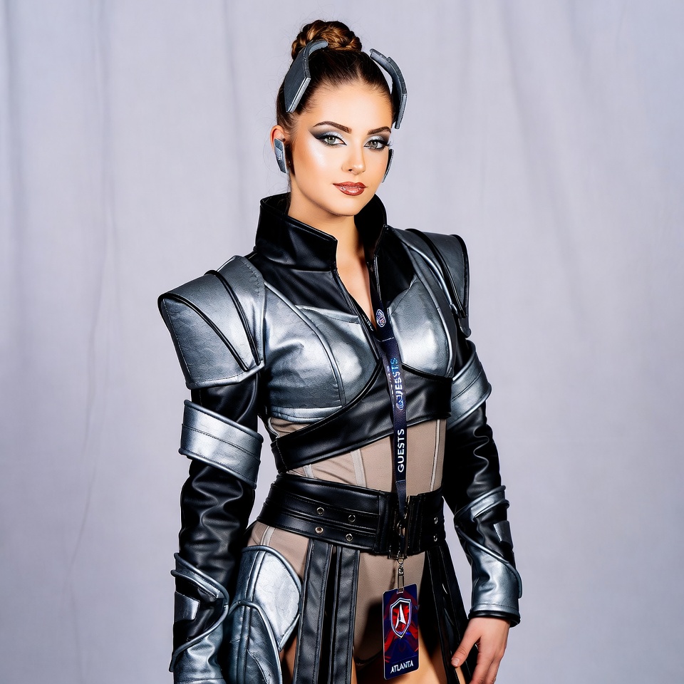 accessories, artwork, attire, character, convention, costume, craft, creativity, design, entertainment, event, exhibition, fashion, futuristic outfit, hairstyle, makeup, model, performance, pose, style