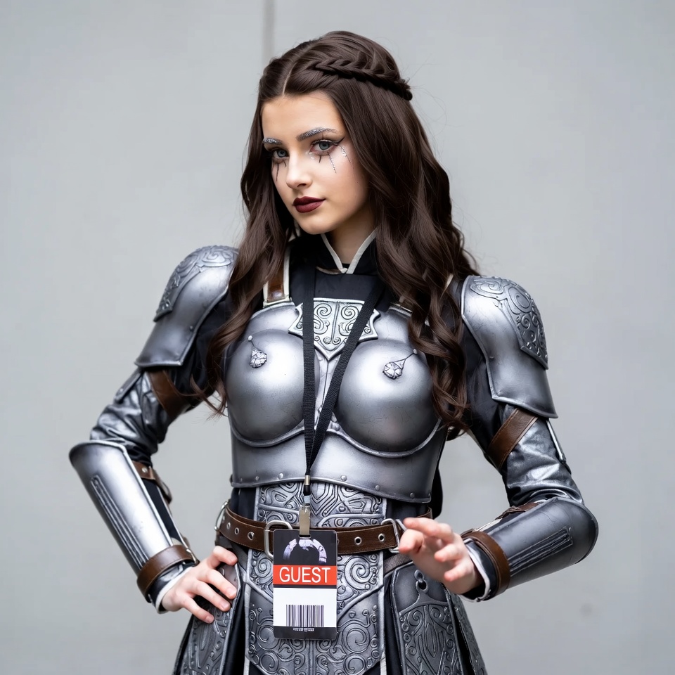 armor, character, convention, cosplay, costume, creative, design, detailed, entertainment, event, expressive, fantasy, female, guest badge, model, posing, showcase, standing, steel, warrior