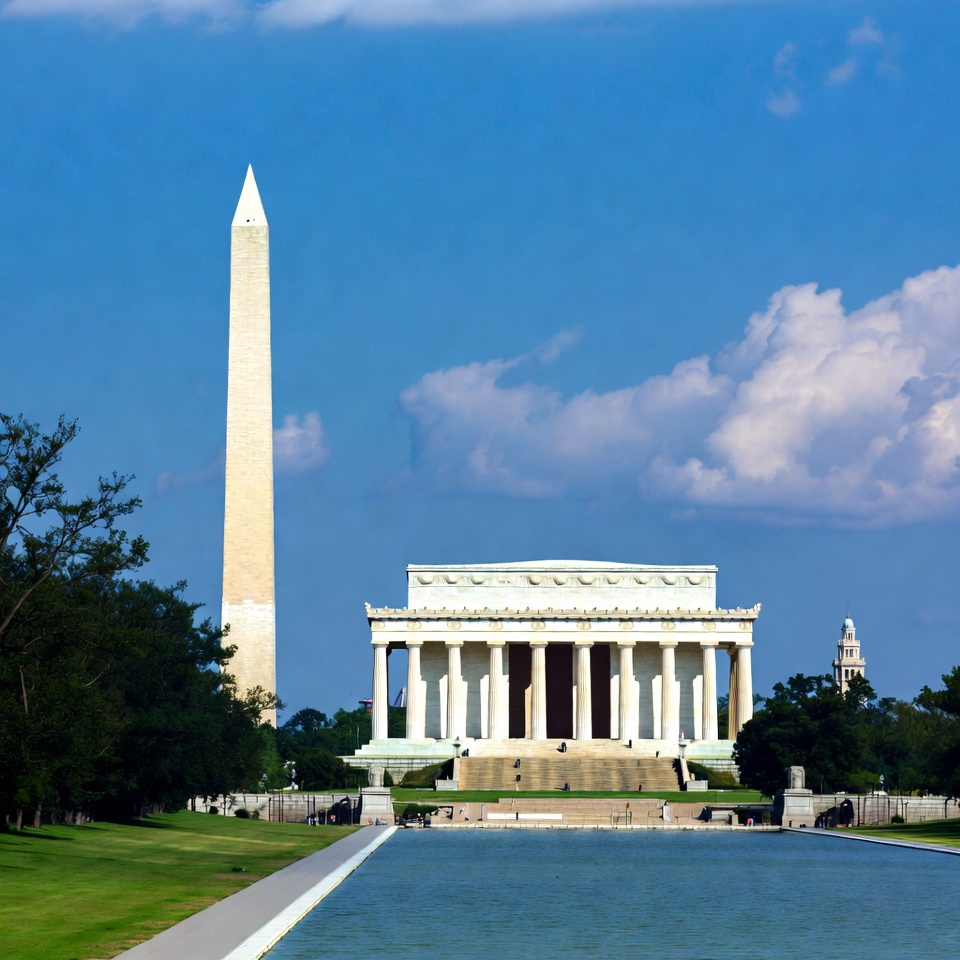 View of the Lincoln Memorial and Washington Monument under a blue sky. The two landmarks are in Washington D.C. with a reflecting pool in front.