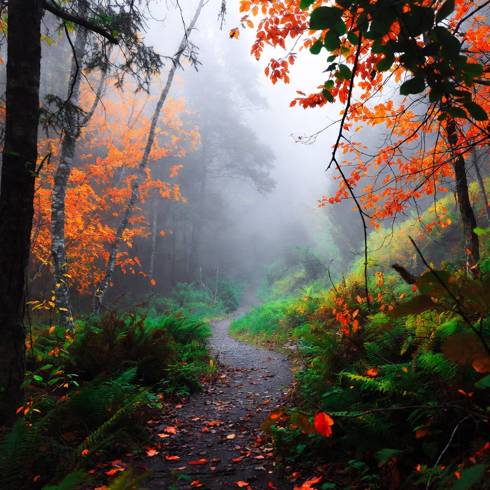 A narrow path winds through a foggy forest with bright orange and yellow leaves on trees. Green ferns line the trail, creating a vibrant scene.