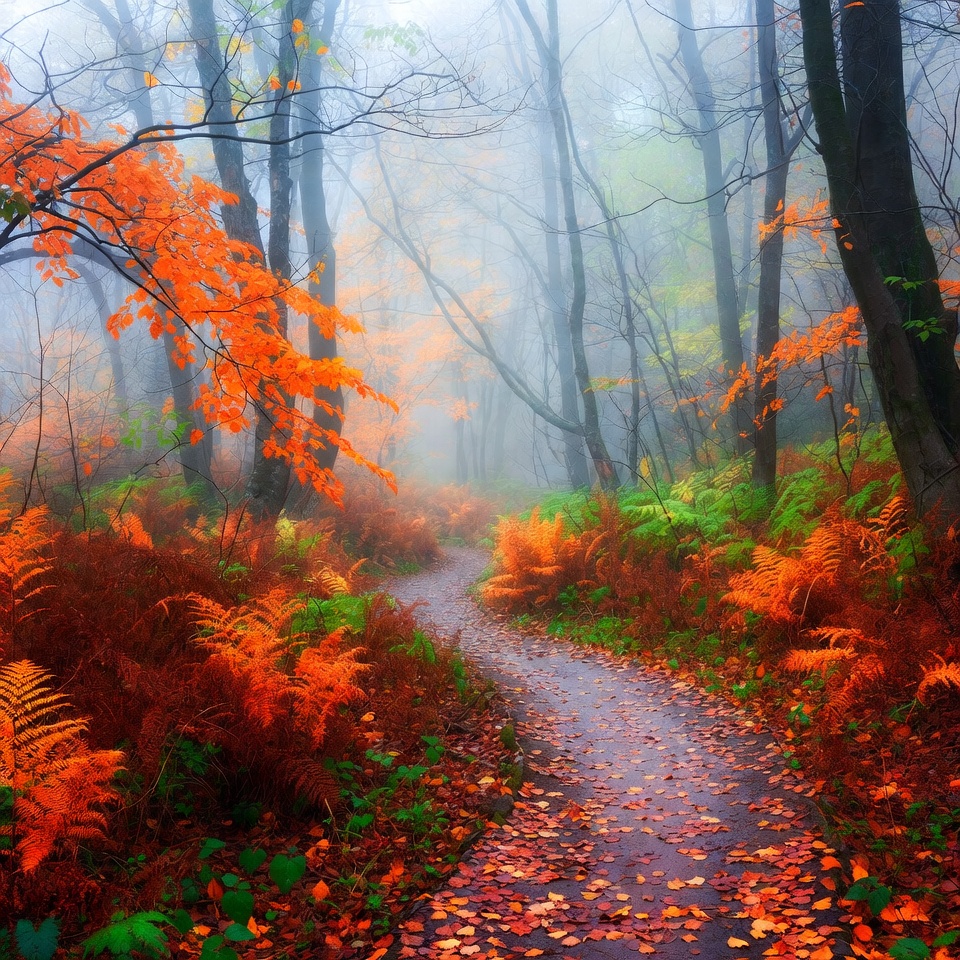 A winding path cuts through a foggy forest. Orange leaves and ferns line the trail. The trees loom above in the misty air.