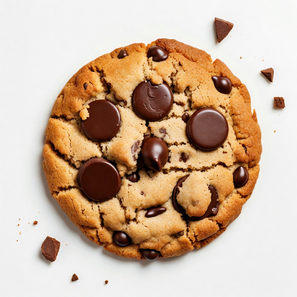 A large chocolate chip cookie sits on a white plate with some chocolate pieces scattered nearby, ready to be enjoyed.