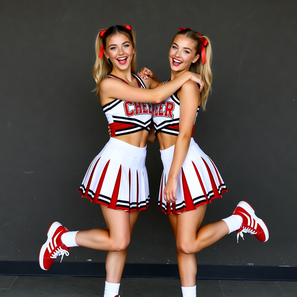 Two cheerleaders stand together, showing a joyful expression. They wear matching outfits and pose playfully in front of a plain background.