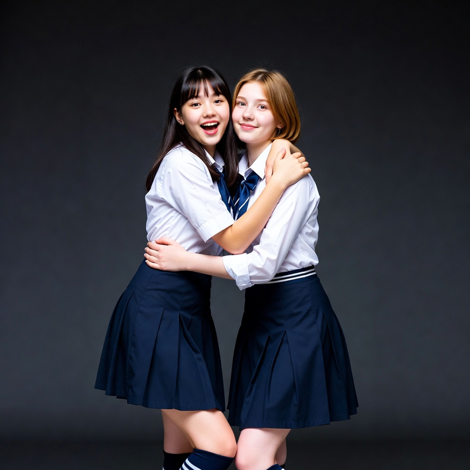 Two friends stand close, wearing school uniforms with skirts and blouses. They smile happily while embracing each other.