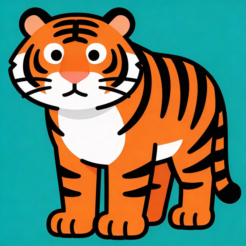 A cartoon tiger stands facing forward on a blue background. The tiger has orange fur with black stripes and a white belly.