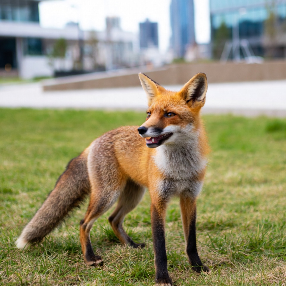 animal, animal behavior, city, curious, day, environment, fox, grass, green space, mammal, modern buildings, natural habitat, nature, outdoor, park, street, sunny, urban, walking, wildlife