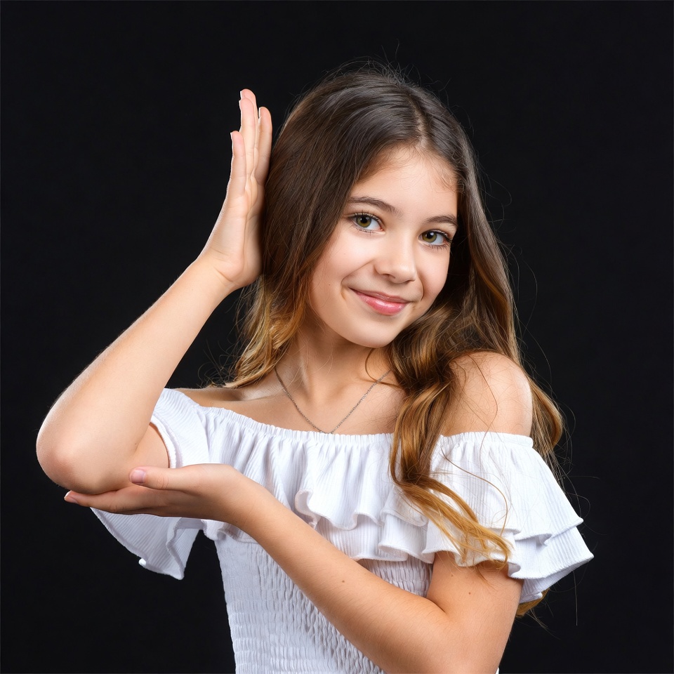 casual, childhood, confidence, dark background, expression, fashion, friendly, fun, girl, hair, hand gesture, happiness, indoor, light, playful, portrait, pose, smile, young, youth