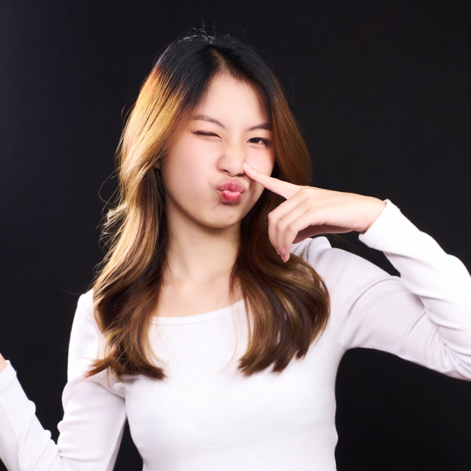 A girl poses playfully with her finger on her nose. She stands against a dark background, smiling and making a silly expression.