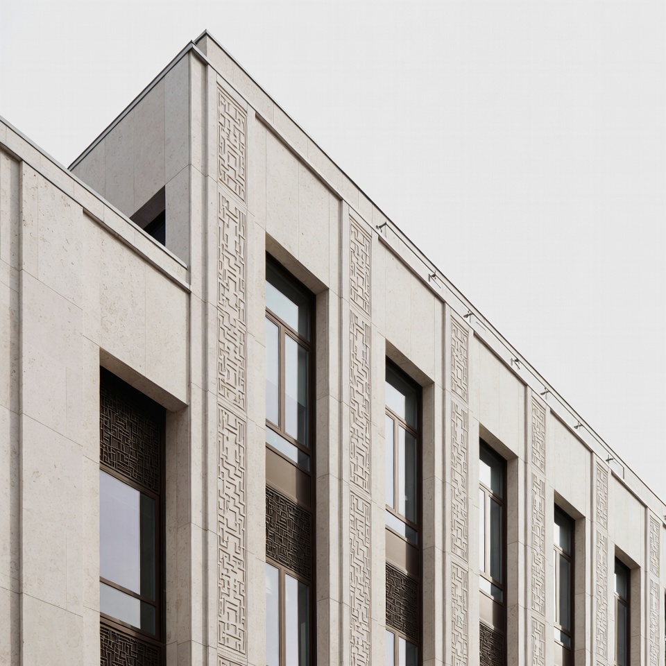 The picture shows a modern building with a detailed exterior. The structure features textured panels and large windows.