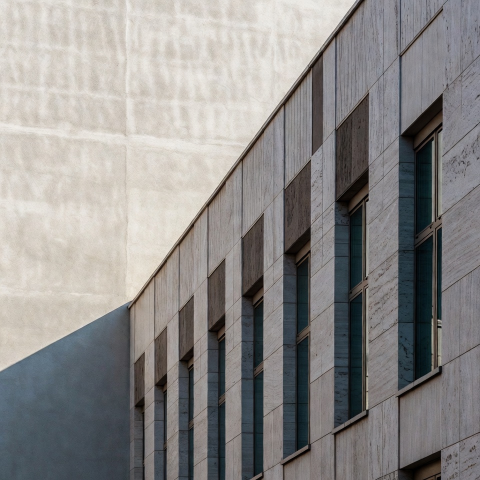 A wall of a modern building shows windows and stone texture. The structure contrasts with a simple backdrop. The setting is urban and contemporary.