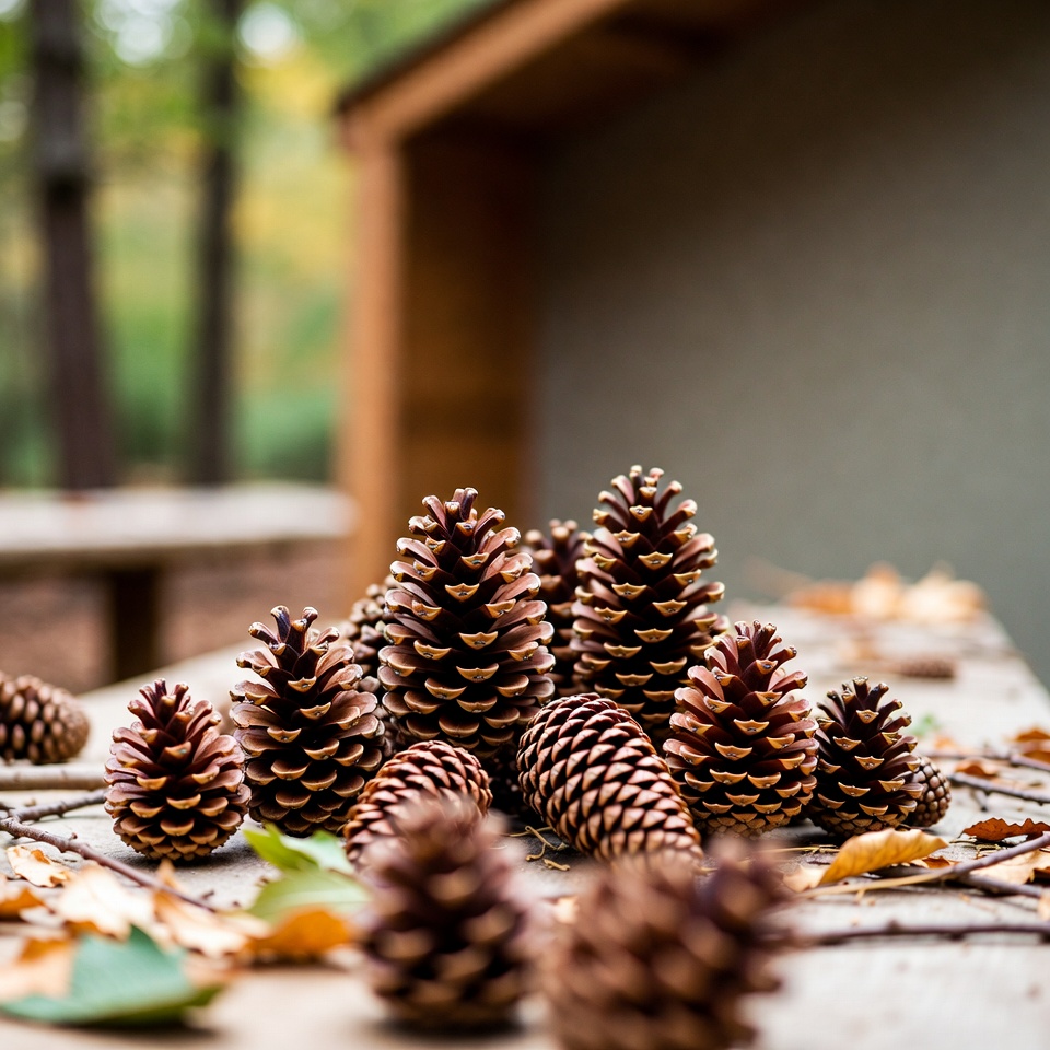 Pine cones are placed on a wooden surface among fallen leaves in a forest during autumn. The scene shows nature's seasonal change.