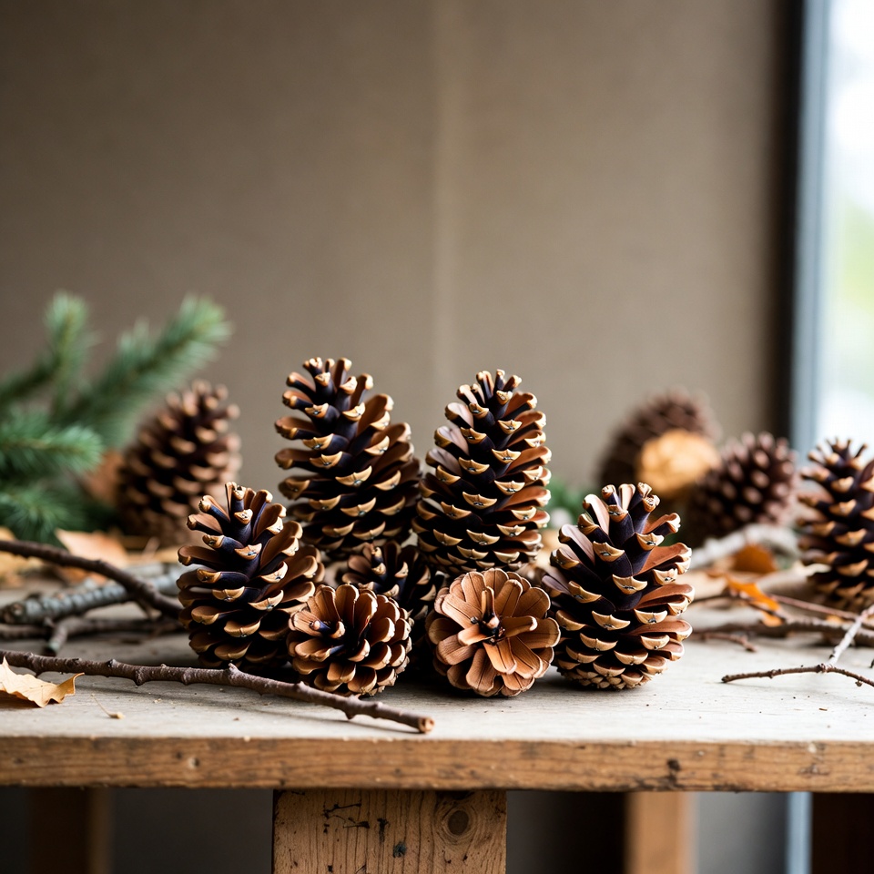 Several pinecones are placed on a wooden table surrounded by twigs and greenery near a window. The scene shows a natural indoor setting.