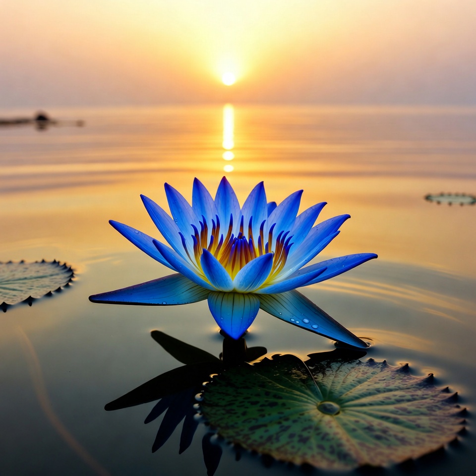A blue flower blooms on the water's surface as the sun sets in the background, creating a colorful scene with reflections.