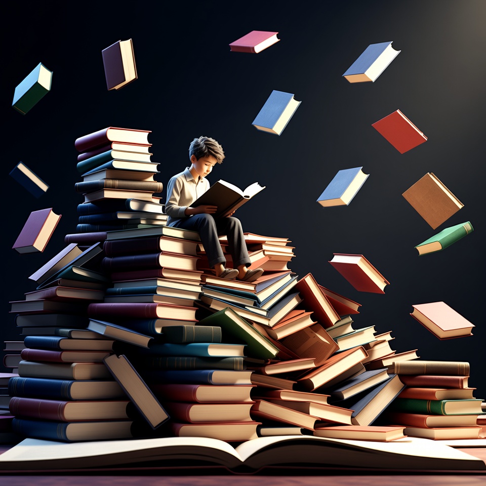 Young boy sits on a large pile of books, focused on reading. Books are scattered around him in a dimly lit space.
