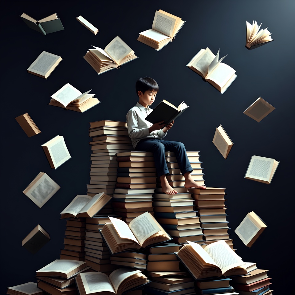 A young boy sits on a tall stack of books while reading. Books float around him in the air, creating a magical scene full of imagination.