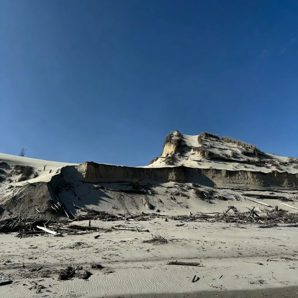 A sandy area with large dunes and a clear blue sky. Fallen branches lie scattered across the ground. The scene captures a natural setting in daylight.