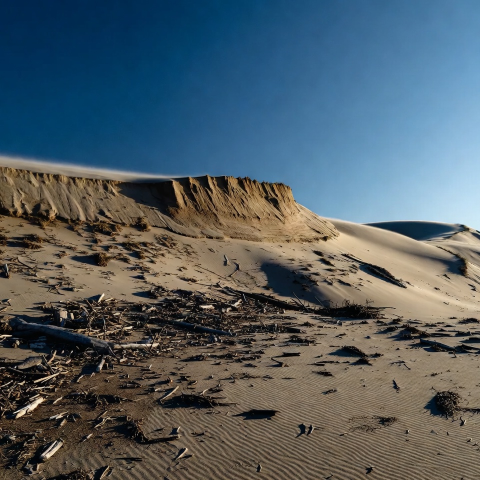 Sand stretches across the land with scattered wood at the base of cliffs under a clear blue sky during sunset.