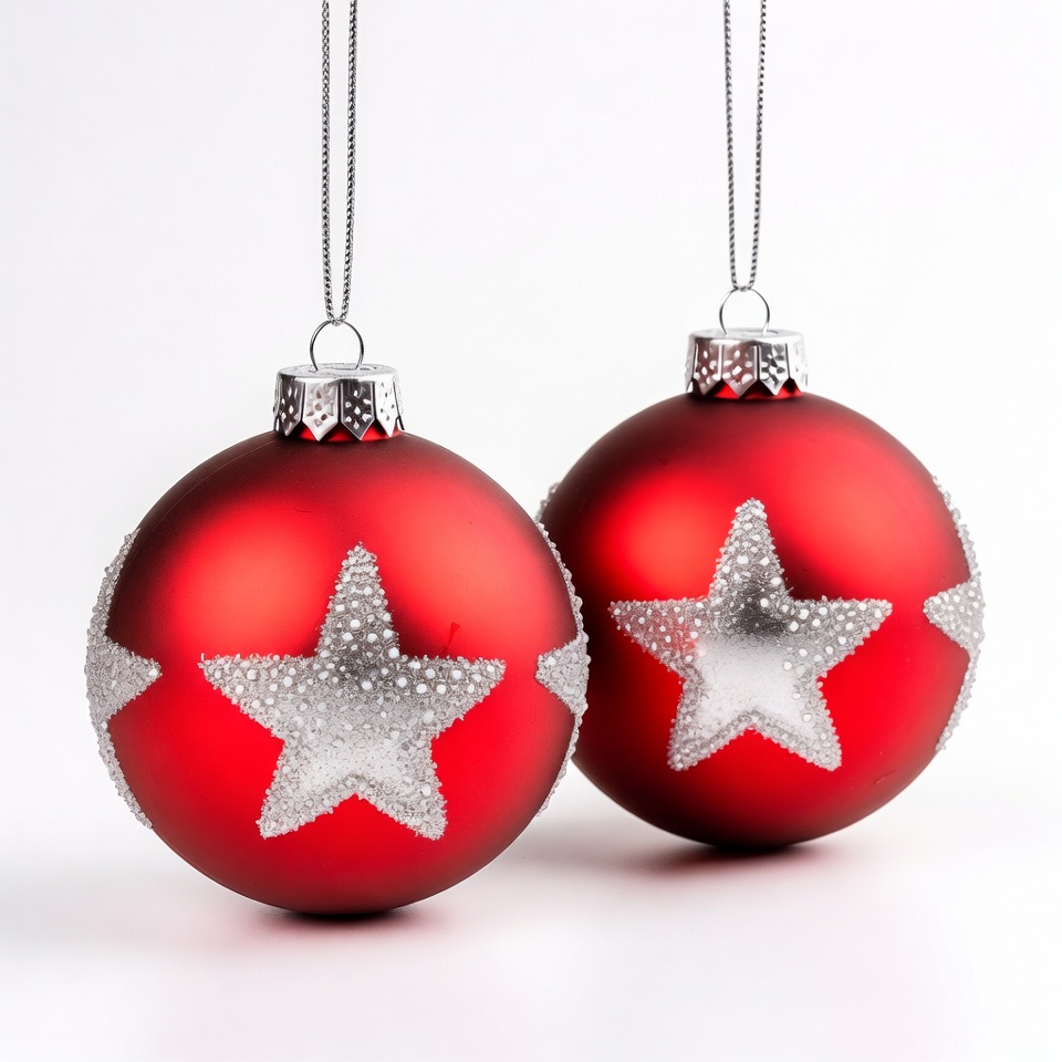 Two red Christmas ornaments hang, each decorated with silver stars. They are shiny and capture light in a simple holiday display.