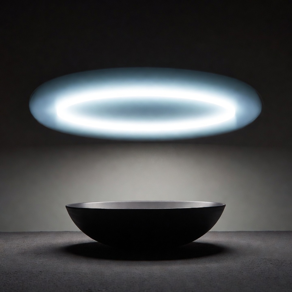A bowl rests on a surface while a glowing ring hovers above it in a dark setting, creating a striking visual effect.