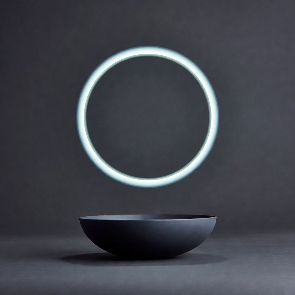 bowl, circle, contrast, dark, design, floating, geometry, illumination, interior, light, minimalist, modern, object, room, scene, shape, simple, space, structure, surround